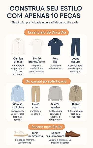 Descubra como montar um guarda-roupa masculino versátil com apenas 10 peças-chave que unem elegância, praticidade e estilo atemporal. Neste guia completo, mostramos como combinar cada item, quais cores priorizar e como adaptar seu visual para diferentes ocasiões — tudo sem abrir mão da sofisticação. Confira também nosso infográfico exclusivo de um armário ideal para quem busca vestir-se bem com inteligência.